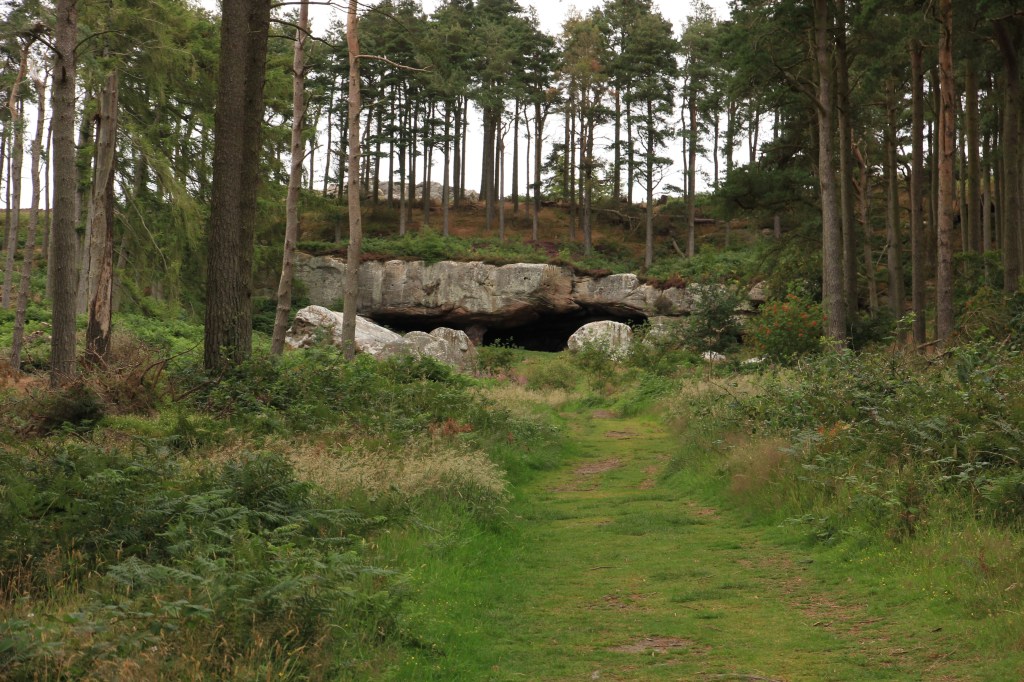 The first imposing sight of St Cuthbert’s Cave in it’s tranquil wooded surroundings