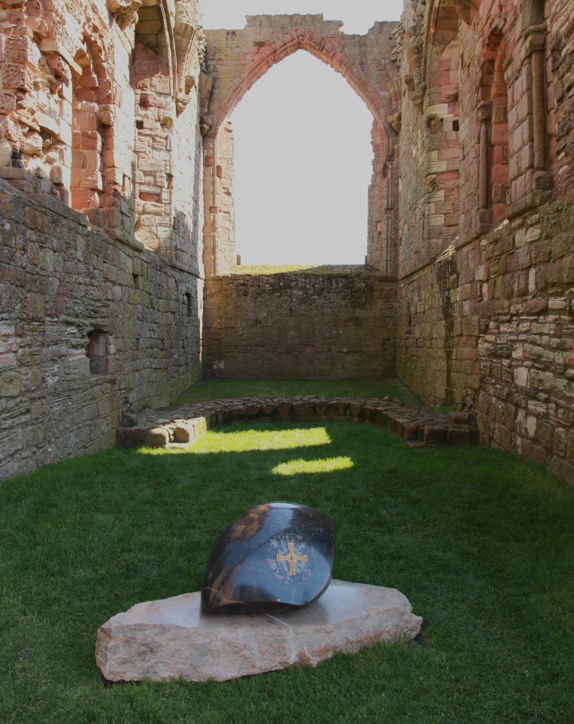 This commemorative stone, featuring St Cuthbert’s Cross and entitled ‘Feather Star Mantle’, was placed in the presbytery of the twelfth century Lindisfarne Priory in 2022. It marks the spot where Cuthbert’s original monument may have been located.