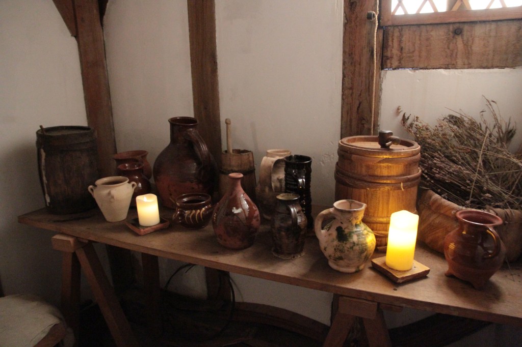 Making our way back through the Gallery and Parlour, another flight of stairs leads down to the catering service rooms that lie off a short corridor opposite the Great Hall, situated on the other side of the modern alleyway. Here we find the buttery and pantry, where the drinks and bread are stored, and where dishes prepared in the kitchen – which has sadly never been identified – are plated up prior to serving.
